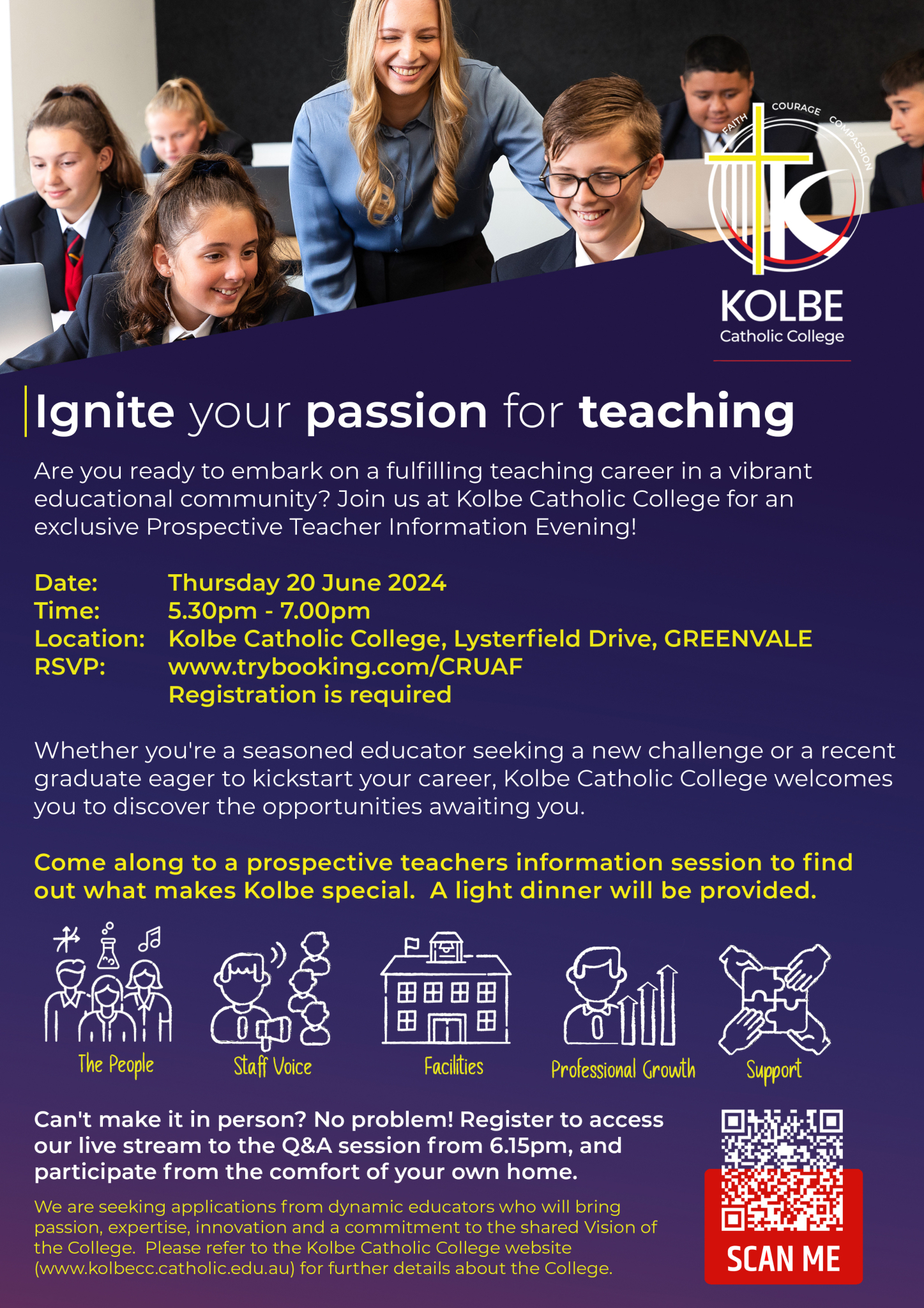 The evening is open to both qualified teachers and university students currently completing an education degree. If you or someone you know is interested in future employment at Kolbe, see the flyer below for more information and details about how to register.