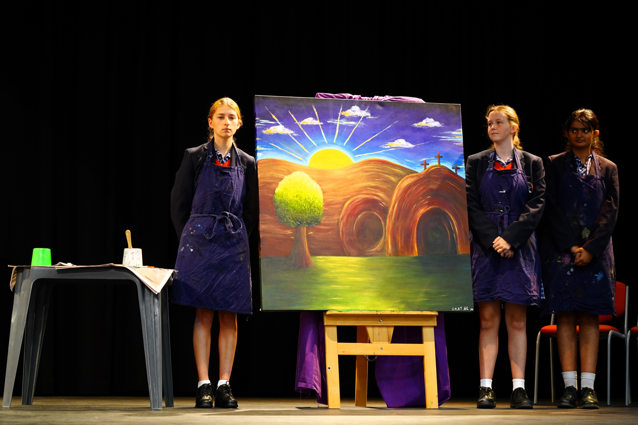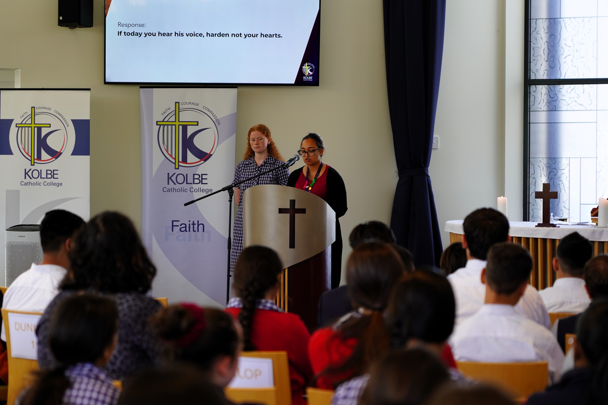 In the final week of Term 1, we gathered as a whole school for our Easter Liturgy. Drawing on some of the Stations of the Cross, the students were reminded of the story of the Passion. This solemn occasion featured dramatic elements, visualising events featured in the Stations of the Cross. The liturgy concluded by revealing an artwork of the empty tomb, proclaiming Jesus’ resurrection. Anabel, Agam and Leah of year 10 are to be congratulated for the creation of the artwork, thanks also to Ms. Segrave for her artistic guidance. As always, the Kolbe Choir elevate any liturgical celebration and their performance of the school song ‘Faith, Courage and Compassion’ did not disappoint. Thank you to Ms Roso for her artistic vision and considerable work to make this liturgy such a meaningful experience.