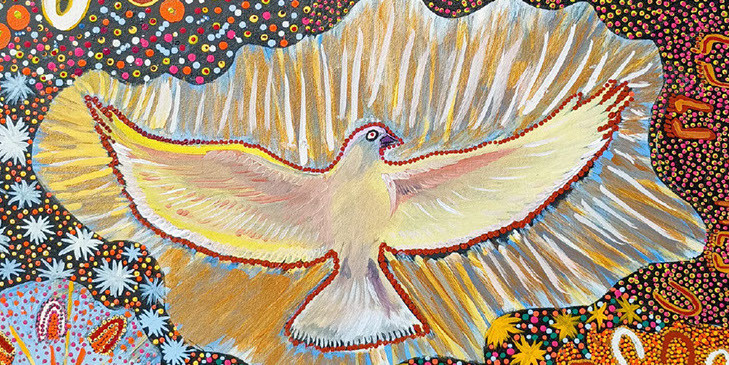 This beautiful artwork, titled Pentecost, that has been created by three artists from the Balgo Community: Magda Lee, Gracie Mosquito and Imelda Gugamen.