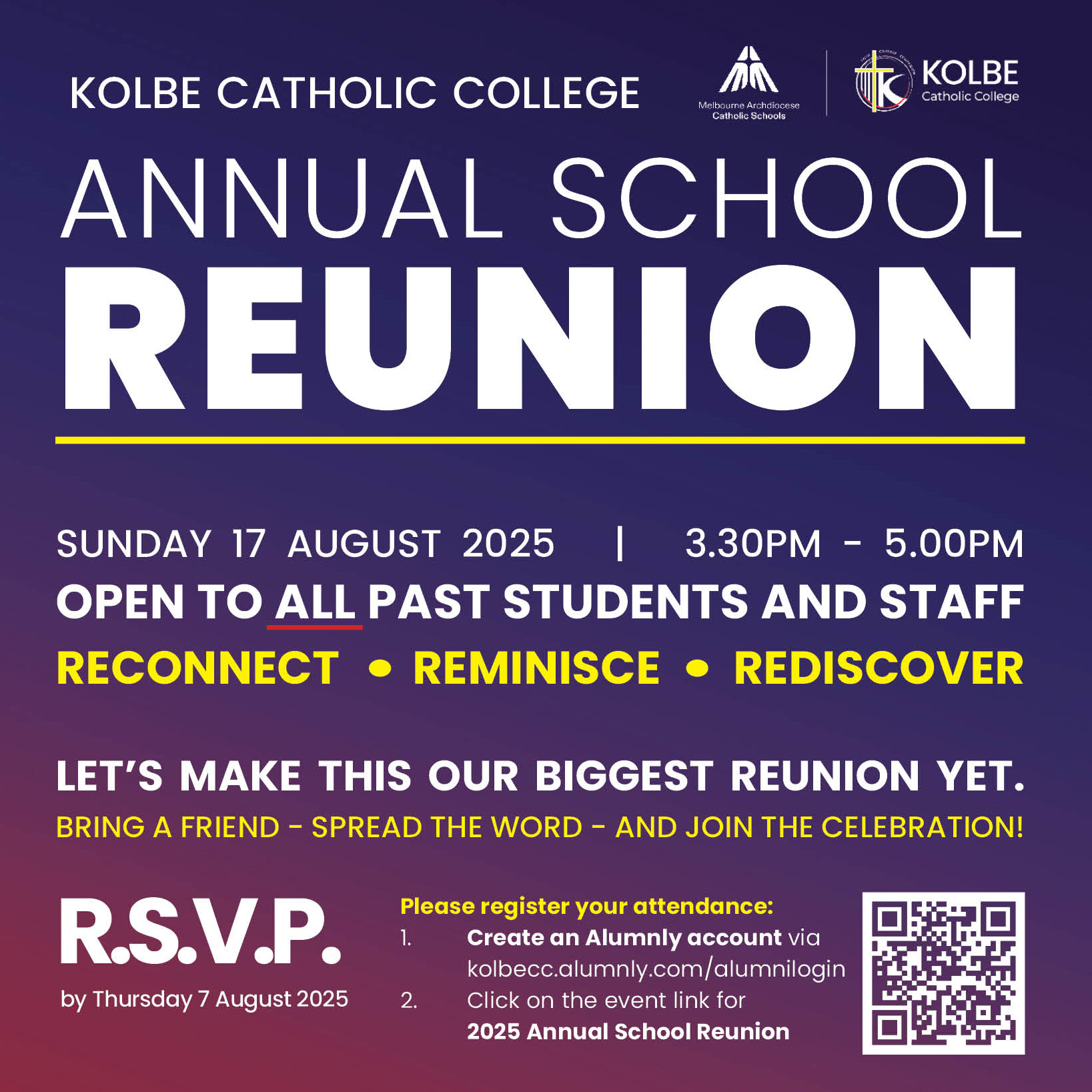 We’re excited to invite you to our annual school reunion on Sunday 17 August, from 3:30 PM to 5:00pm!