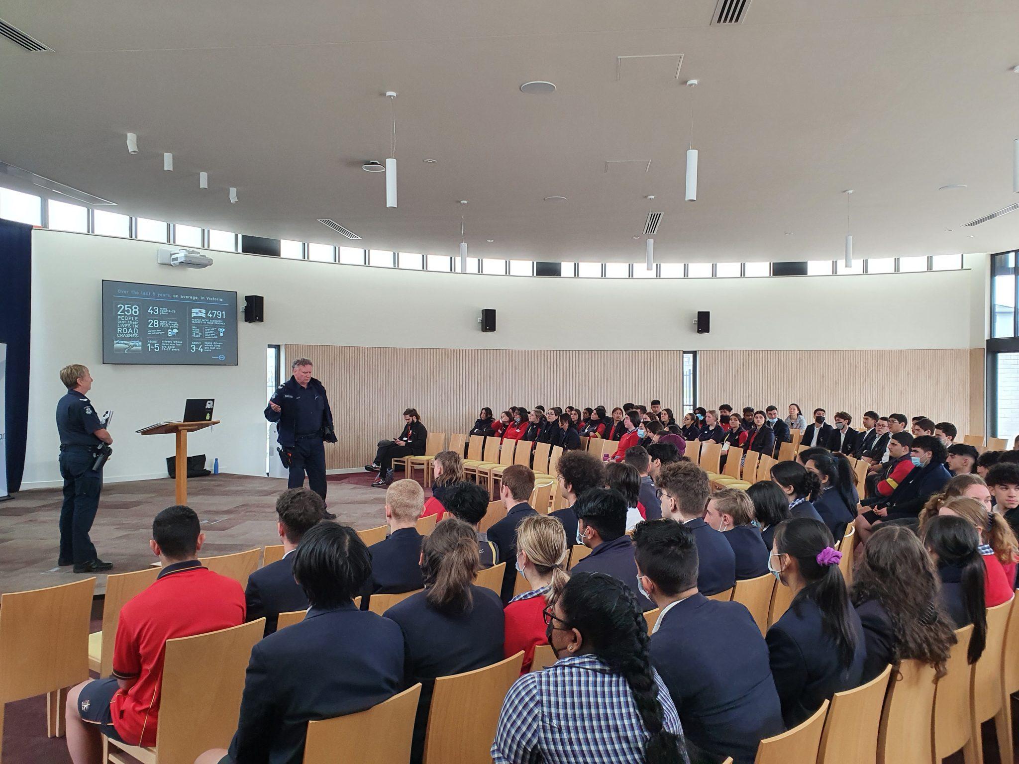 On October 18 2022, the Year 11 cohort were joined by the Fit2Drive team where students participated in a program about how to be a safe driver. The students were introduced to the team in the chapel during Lesson 3, where they were then split off into their pastoral groups to reflect on what being a safe driver means and how to be one. They were then greeted by guest speakers from Victoria Police and Fire Rescue Victoria, where they demonstrated statistics of unsafe driving, the consequences of this as well as how to avoid them.