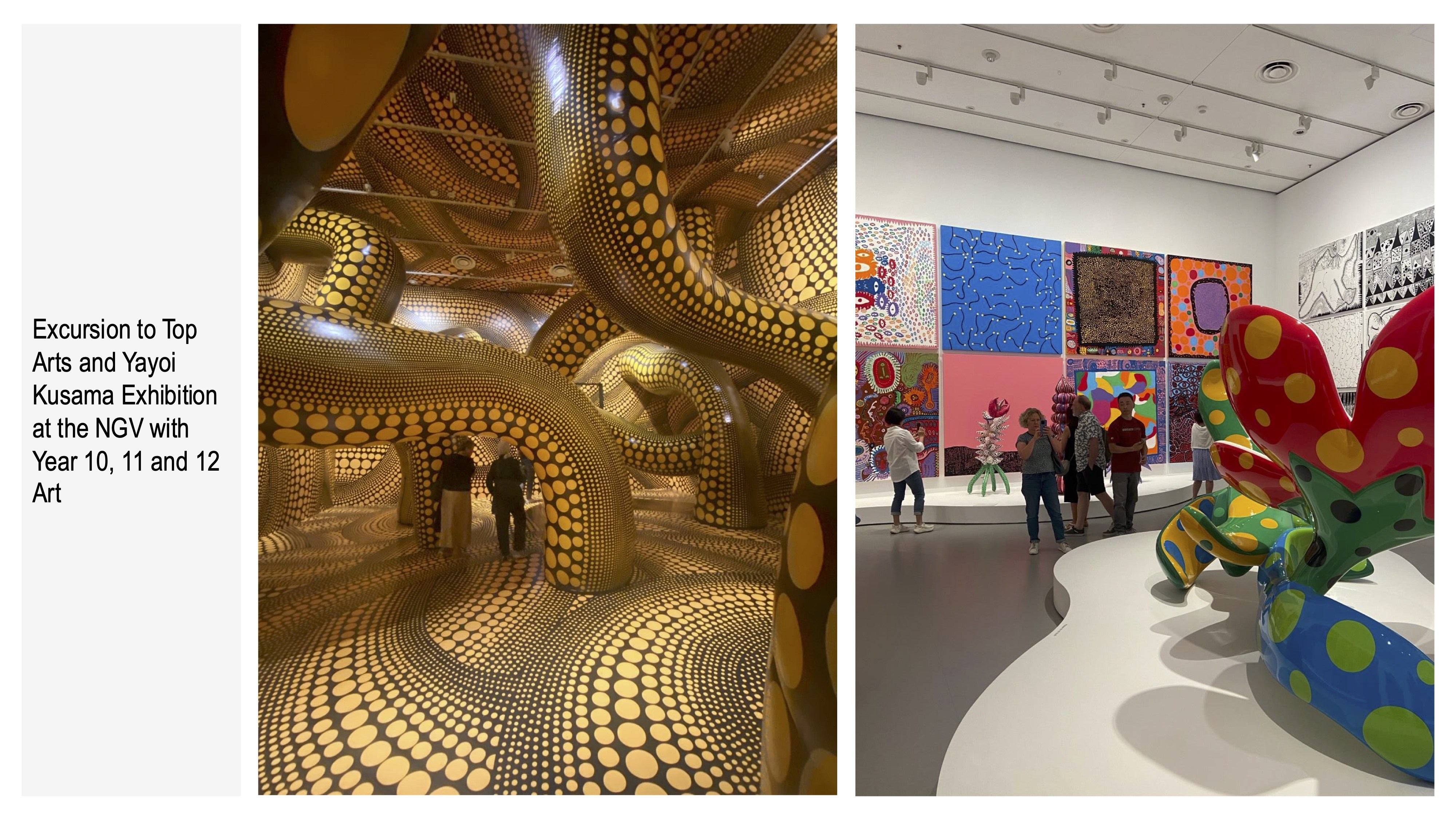 Our Visual Arts, Media, and Visual Communication Design programs have had a fantastic start to the year. VCE and Year 10 students recently embarked on enriching excursions, visiting the Top Arts and Yayoi Kusama exhibitions at the NGV, Top Screens at ACMI, and Top Design at the Melbourne Museum. These experiences have provided invaluable inspiration and insight into art and design in specific contexts.