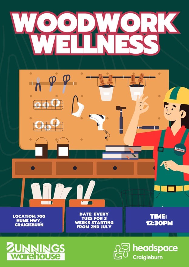 Headspace presents Woodwork Wellness. A holiday program for 15-25 year olds focusing on woodwork. No need to register, just turn up! Contact headspace for more information on 9339 0919.